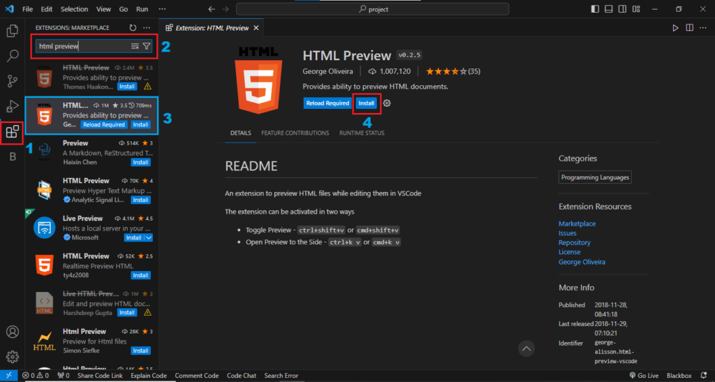Another handy extension for working with HTML in VS Code is ‘HTML Preview.’ You can install it by clicking on the extensions icon in VS Code and searching for ‘HTML Preview.’