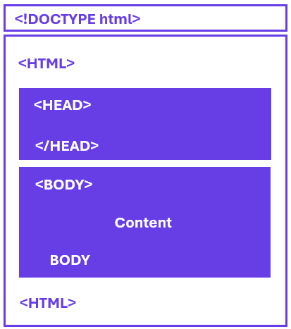 <!DOCTYPE html>specifies the HTML version.<html>wraps around all content.<head>contains metadata.<title>sets the webpage title.<body>holds the visible content.